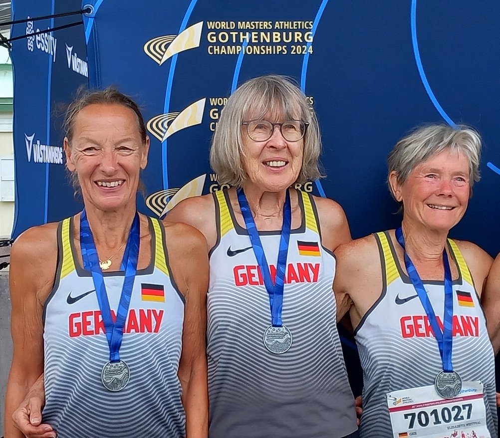 Beide – Robert und Nicola - wurden von Gudrun in den Schatten gestellt; wir hatten sie durchaus als Mitfavoritin gesehen und sie konnte diese Erwartungen vollauf erfüllen. Am erfreulichsten dabei war, dass sie ihre Angst vor dem Hürdenlauf (nach schwerer Hamstring-Verletzung 2023 in Torun) erfolgreich überwinden konnte und schon hier die Führung übernahm. Ihre Zeit hätte im Einzelwettbewerb, zu dem sie aus Vorsichtsgründen nicht gemeldet hatte, klar zum Sieg gereicht! Mit Bestleistungen in den Würfen und drei weiteren SBs kürte sie sich – als Titelverteidigerin – erneut zur Weltmeisterin in der W75.