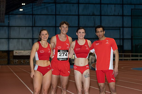 Ein enges Rennen zwischen unserem NORD-Team und dem SCC Berlin gab es in der Mixed-Staffel über die 400m-Distanz. Die Leistungsträger mit Karolina Pahlitzsch, Alexander Hanke und Charlotte Wolf suchten für den Schlussevent dieser Meisterschaften noch den zweiten männlichen Mitläufer. Da alle „Verdächtigen“ bereits viele Läufe in den Beinen hatten, fiel die Wahl auf Marwan Mahmoud, der bereits im B-Finale gesprintet war und auch die 200m in 23,89s absolvierte hatte. Er stellte sich uneigennützig als Staffelläufer für seinen ersten 400m-Lauf zur Verfügung; die Staffel war damit komplett. In ordentlicher Renneinteilung konnte Marwan als Startläufer seine 400m durchlaufen, aber die SCC-Konkurrenz, u.a. mit der Deutschen 400m-Meisterin, Skadi Schier, war doch schon ein ganzes Stück enteilt. Um so größer war der Einsatz unserer Langsprinter, insbesondere von Karolina und Alexander, die sich auf die Verfolgung machten. Als Schlussläuferin ging Charlotte eine Runde vor dem Ziel an Michelle Janiak vom SCC vorbei und kämpfte sich als Siegerin ins Ziel. Mit der Zeit von 3:34,38min, gegenüber dem SCC in 1:34,87min, gab es die Goldmedaille und gleichzeitig wurde die Norm für die Deutschen Staffelmeisterschaften erfüllt, die bereit am 04. Mai 2025 in Hamburg stattfinden.