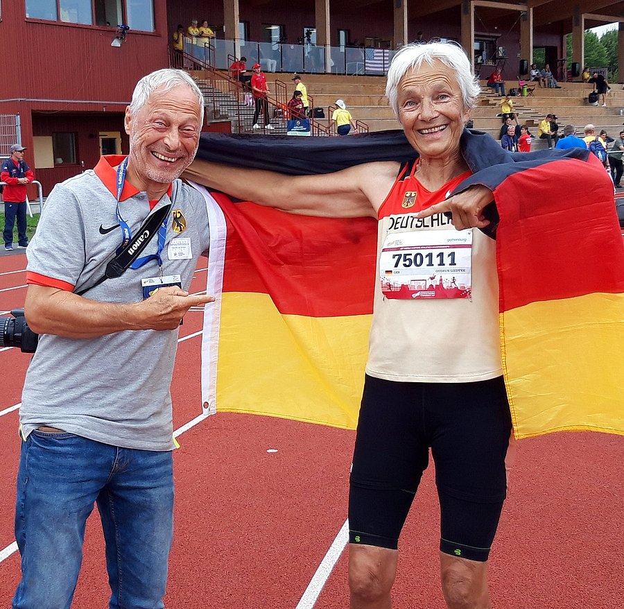 Gudrun musste auf ihrer Paradestrecke Langhürden nur über 200m mit 5 „Hindernissen“ laufen, was ihr souverän gelang und den 2. WM-Titel einbrachte. Unser in Oberhausen lebender „Alt-Senior“ Klaus-Dieter hatte zwischenzeitlich das 100m-Finale der M85 erreicht, wo er 4. wurde. Denselben Platz belegte Elisabeth über 800m der W70.