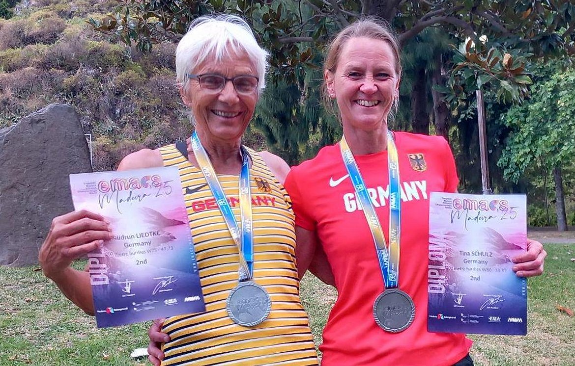 An den folgenden beiden Tagen absolvierten Heike Hesse und Gudrun Liedtke jeweils ihre 7-Kämpfe, während Nicola Iwanowski leider krankheitsbedingt absagen musste. Gudrun errang mit ihrer guten Hochsprungleistung und einem schnellen, kämpferischen 800m-Lauf die Silbermedaille hinter der bekannt dominierenden Italienerin Sfrorzi. Heike konnte dank Ihres konsequenten Aufbautrainings nach ihrer sehr schweren Verletzung (Hamstring-Abriss) im Vorjahr bei den deutschen Meisterschaften an ihre hohe Leistungsfähigkeit wieder erstaunlich schnell anknüpfen und strahlte über einen sehr guten 4. Rang in der W 55 mit großartigen 4517 Punkten bei sehr starker Konkurrenz. In allen Disziplinen erreichte sie ein ausgeglichen hohes Niveau, herausragend insbesondere ihre 200m in 31,51sec, aber auch ihre beeindruckenden 2:50,92min über 800m.