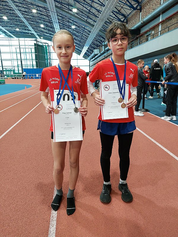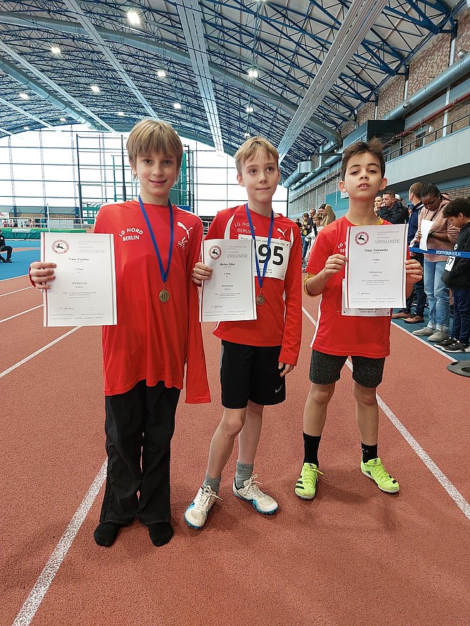 Weiter ging es mit 50m Hürden für die U12. Hier erreichten alle drei Starter das Finale und holten Medaillen: Timo in Gold, Mateo in Silber und Finja Schröer in Bronze. Der Sprint ohne die Hürden brachte weitere Medaillen: Im Finale holte bei den Mädchen Kiana Jannowsky Bronze. Im Vorlauf war sie sogar mit 8,09s noch etwas schneller und damit neue Bestzeit gelaufen. Bei den Jungs sicherte sich Mateo im Finale die Silbermedaille. Auch er lief im Vorlauf seine neue Bestzeit von 7,72s. Diego sicherte sich mit neuer Bestzeit von 8,15s den 8. Platz. Benno lief die 50m in 9,20s.